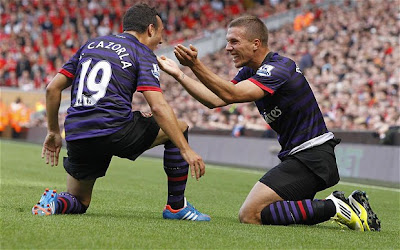 So a 2-1 win at Anfield is always something to celebrate, even more so when you look at the Premier League table this afternoon. We've narrowed the gap on Spurs in 3rd place to just 4 points - it was 10 this time last week. We've also piled on the pressure for Chelsea, who must win at West Brom this afternoon to remain in touch with us (currently 0-0 at the time of writing). The negatives from this afternoon? Mikel Arteta's concussion looked pretty serious and I've read reports he's had to go to hospital to be checked over. Hopefully our Spanish playmaker will be alright. Matters were made worse when Abou Diaby, making his return this afternoon from another long-term injury, limped off with 10 minutes left because he'd hurt himself again. I haven't heard whether its a recurrence of the injury he's just recovered from, but hopefully not. The guy has no luck where his health is concerned.